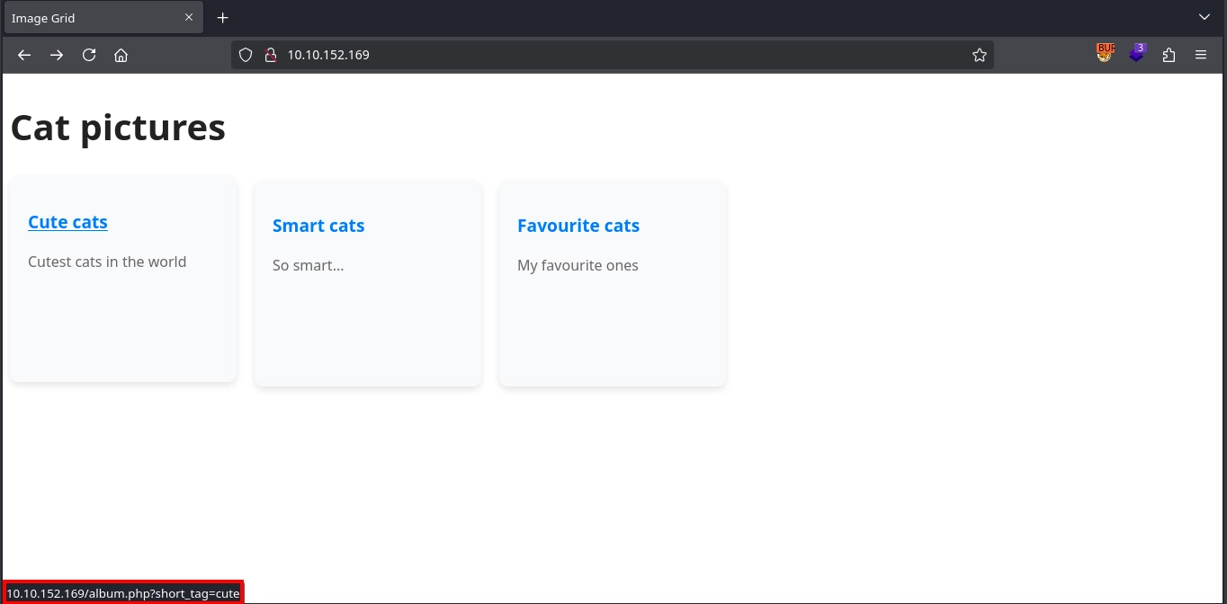 Visiting http://10.10.152.169/, we see a site for cat pictures with links to /album.php, with the short_tag variable set to cute, smart, or fav, depending on the album we choose.