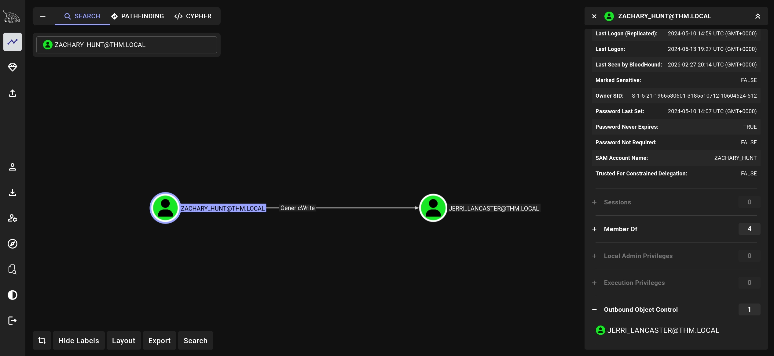Checking the permissions for the zachary_hunt user in BloodHound, we can see that the user has GenericWrite rights over the jerri_lancaster user. We can use this to perform a targeted Kerberoasting attack by leveraging our write permissions to add a temporary SPN to that user and then requesting a service ticket to perform the usual Kerberoasting.