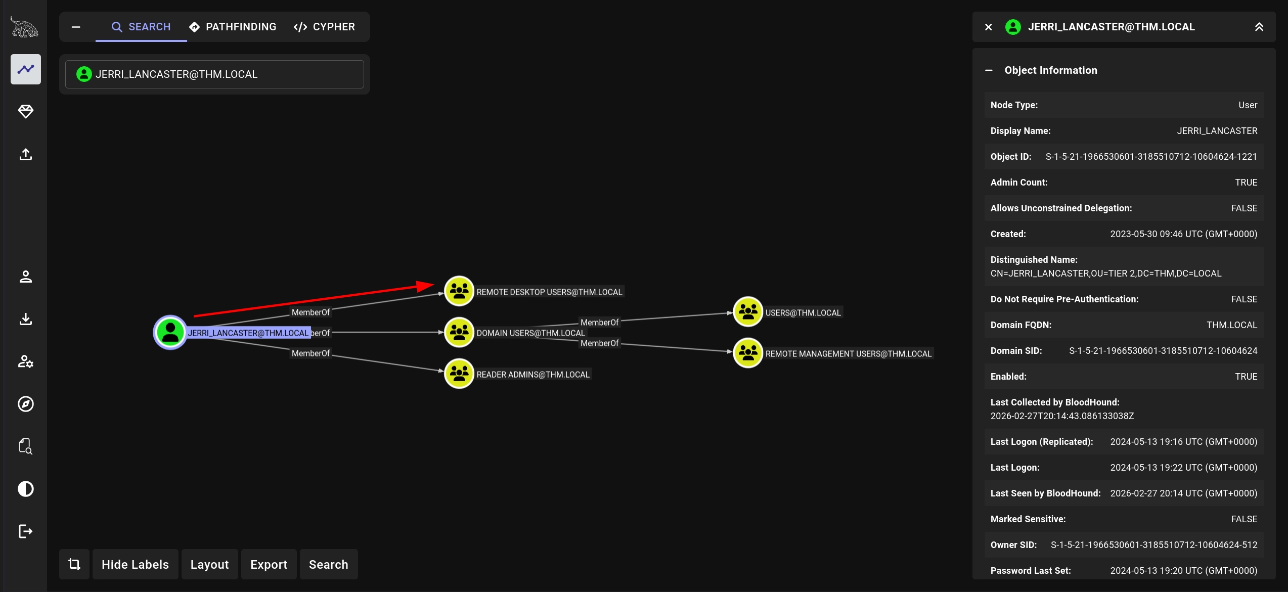 Checking the permissions for jerri_lancaster in BloodHound, we can see that the user is a member of the Remote Desktop Users group.