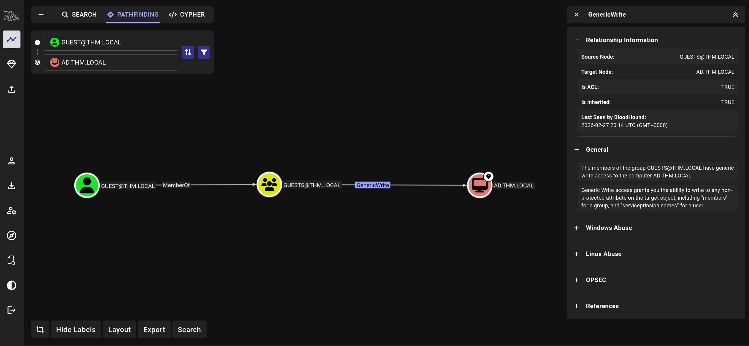 If we use the BloodHound data we collected to check the permissions for the guest account, we can see that there are multiple permissions assigned to the user, with the most interesting one being GenericWrite access over the Domain Controller.