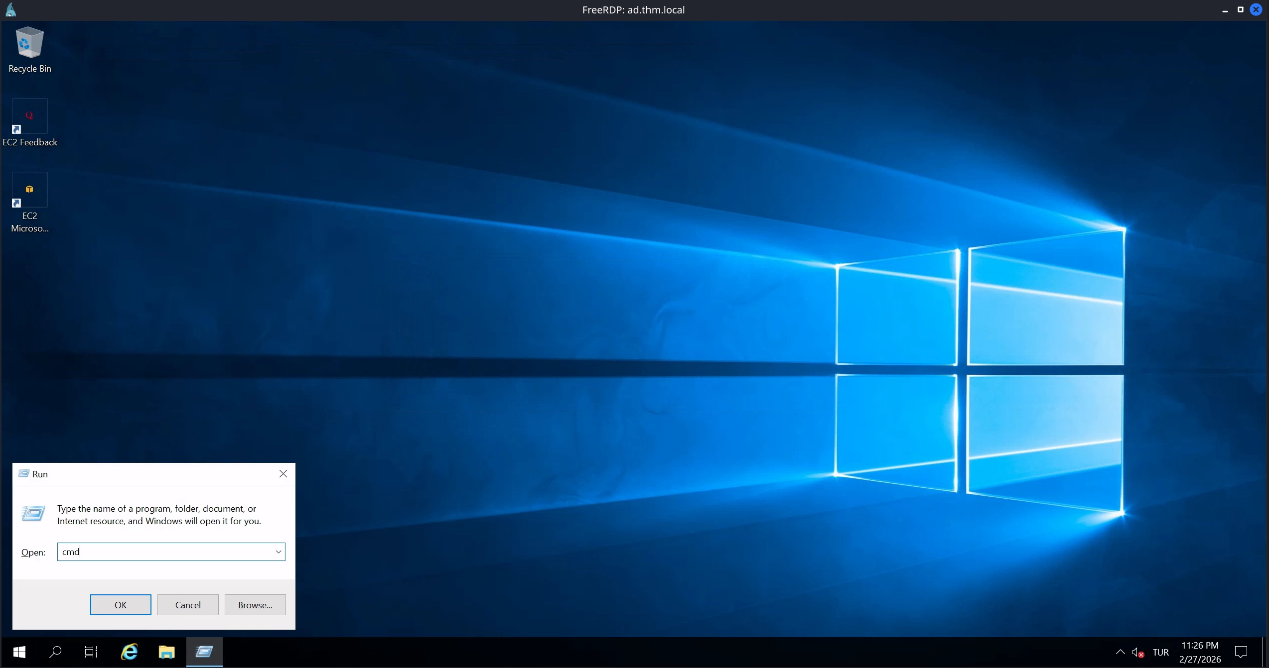 We are successfully able to RDP to the machine; however, we encounter some errors related to profile creation for the user. This is not an issue, as we can simply ignore them and use the WIN + R shortcut to spawn a Run dialog box, which we use to launch a command prompt by entering cmd.