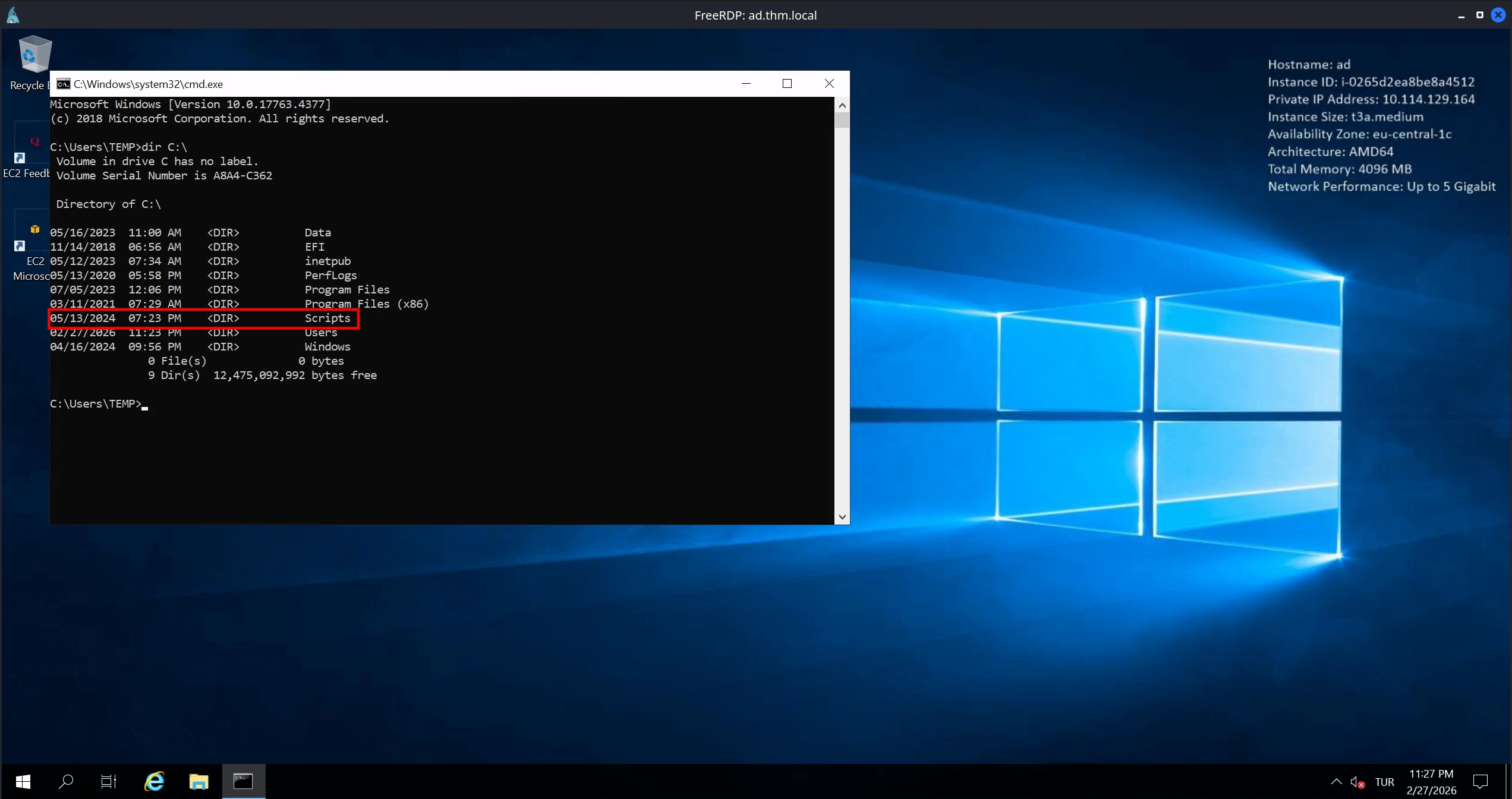 Using this command prompt to enumerate the file system, we notice an interesting directory on C:\ called Scripts.