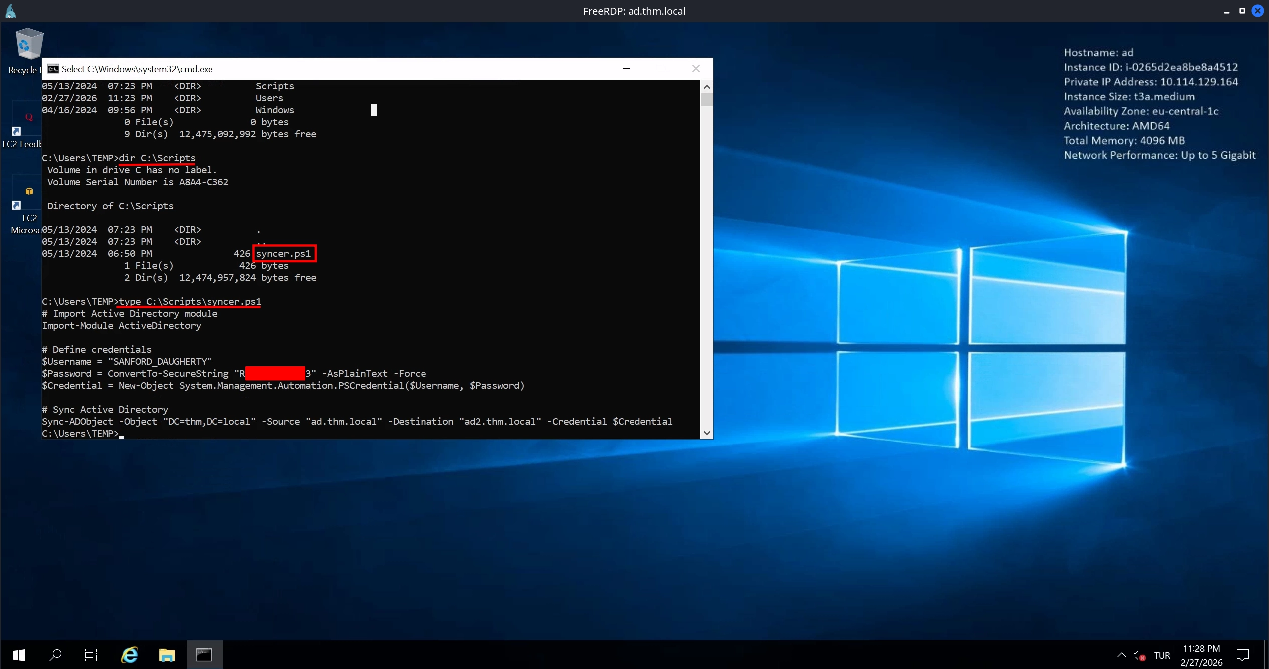 Checking the C:\Scripts directory, there is a single PowerShell script called syncer.ps1. Upon reading it, we see that it contains credentials for the sanford_daugherty user.